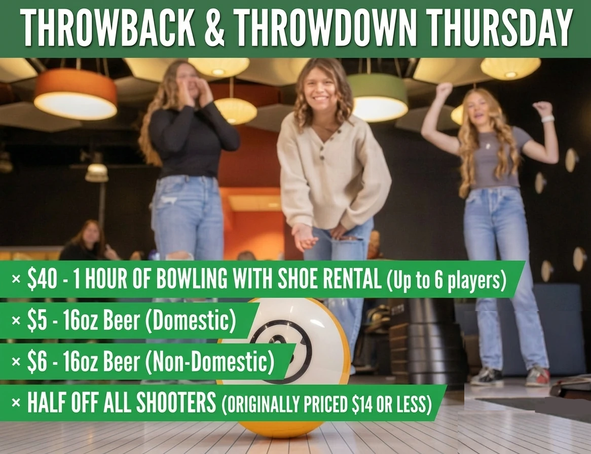 THROWBACK & THROWDOWN THURSDAY - $40 Bowling Special: 1 hour of bowling with shoe rental (Up to 6 players) - Beer Specials: $5 - 16oz Beer (Domestic) $6 - 16oz Beer (Non-Domestic) - Half Off All Shooters originally priced $14 or less