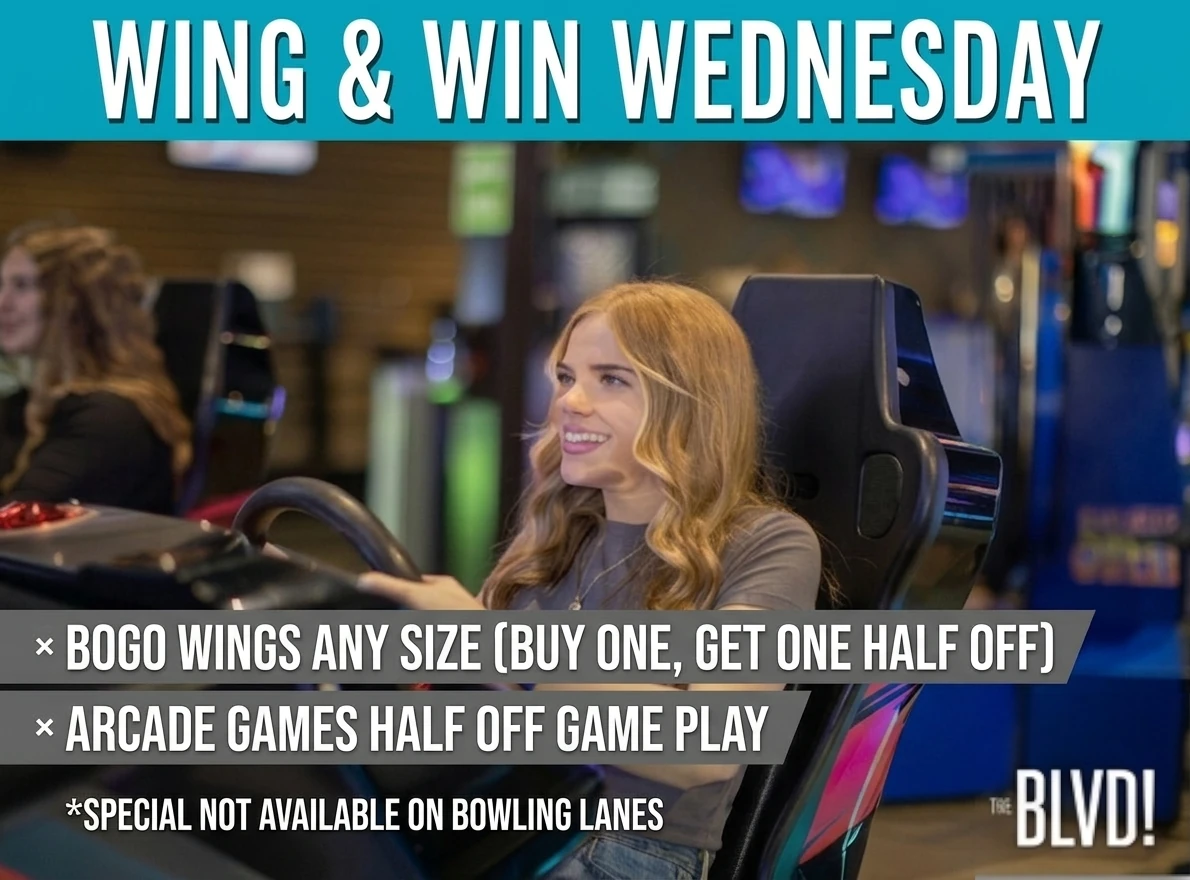 WING & WIN WEDNESDAY -BOGO Wings Any Size (Buy one, get one half off) -Arcade Games Half Off game play *SPECIAL NOT AVAILABLE ON BOWLING LANES