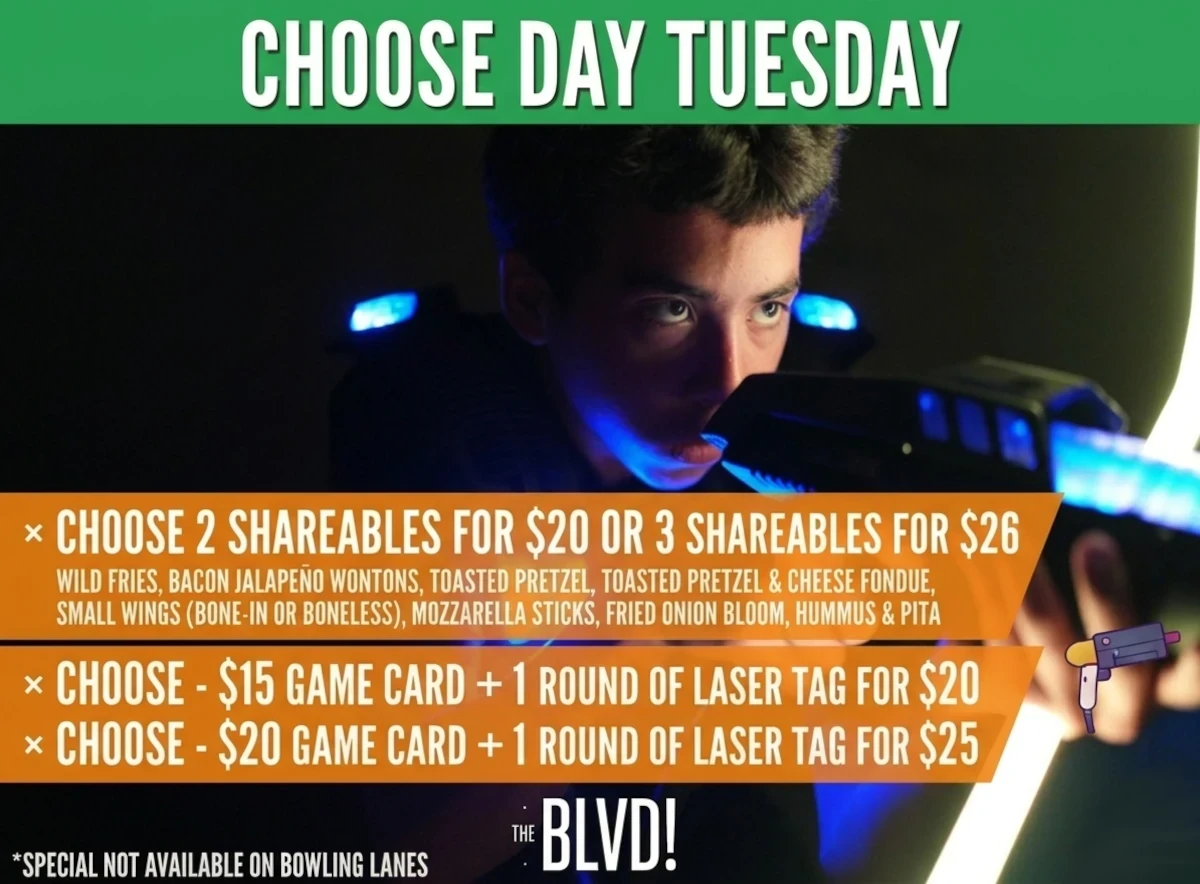 CHOOSE DAY TUESDAY Choose 2 Shareables for $20 or 3 for $26: Wild Fries, Bacon Jalapeño Wontons, Toasted Pretzel & Cheese Fondue, Small Wings, Mozzarella Sticks, Fried Onion Bloom, Hummus & Pita Choose: $15 Game Card + 1 Round of Laser Tag for $20 $20 Game Card + 1 Round of Laser Tag for $25 […]