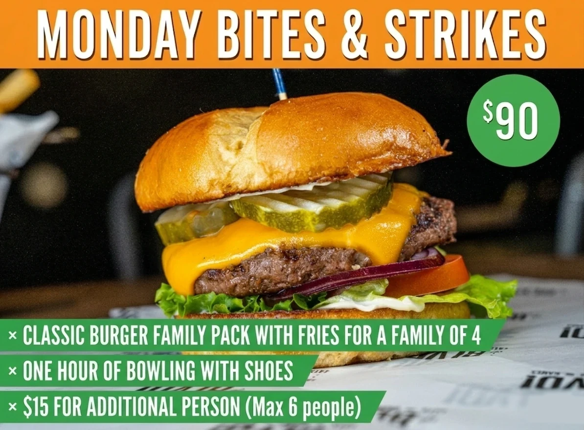 MONDAY BITES & STRIKES $90 Package Includes: - Classic Burger Family Pack with fries for a family of 4 - One hour of bowling with shoes - $15 for each additional person (Max 6 people)