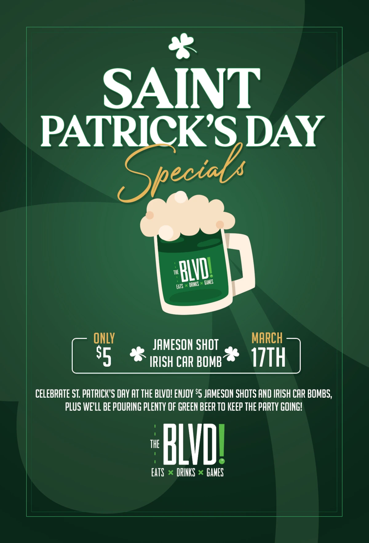 Saint Patrick's Day Specials Celebrate St. Patrick's Day at The BLVD! Enjoy $5 Jameson shots and Irish Car Bombs, plus we'll be pouring plenty of green beer to keep the […]